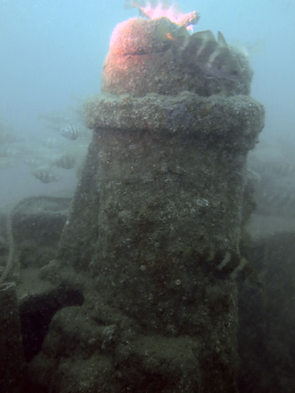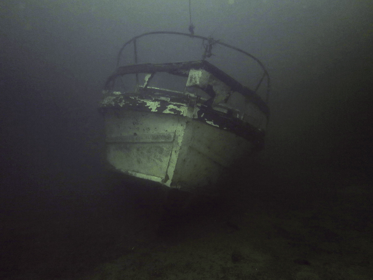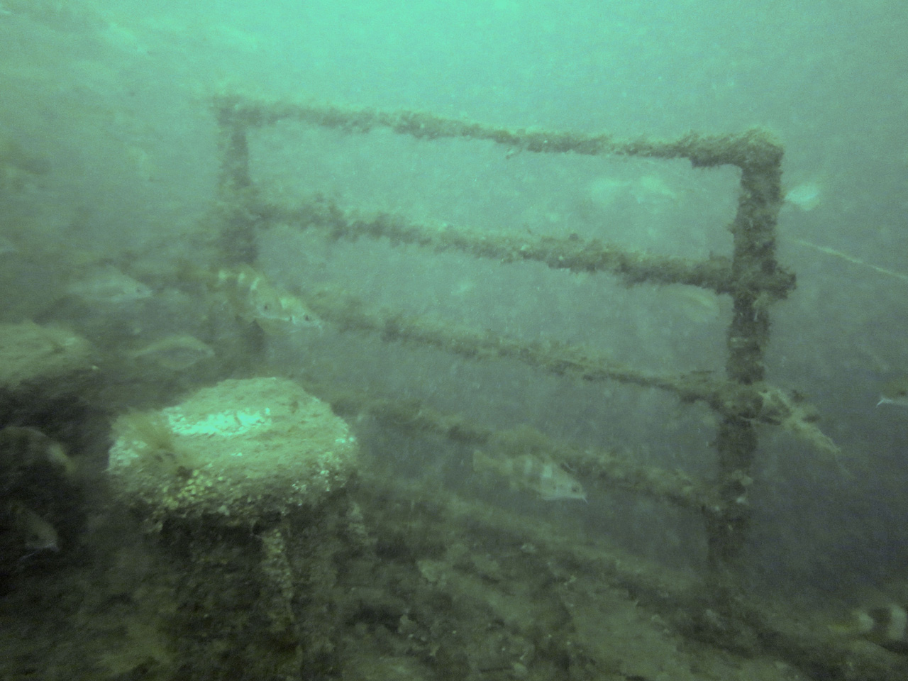 He and I were amongst the first divers in the water at 9AM and quickly descended past the 6M platforms and into the 25M pit, before ascending the wall and making our way over to the wheel house and cabin cruiser at around 15M.