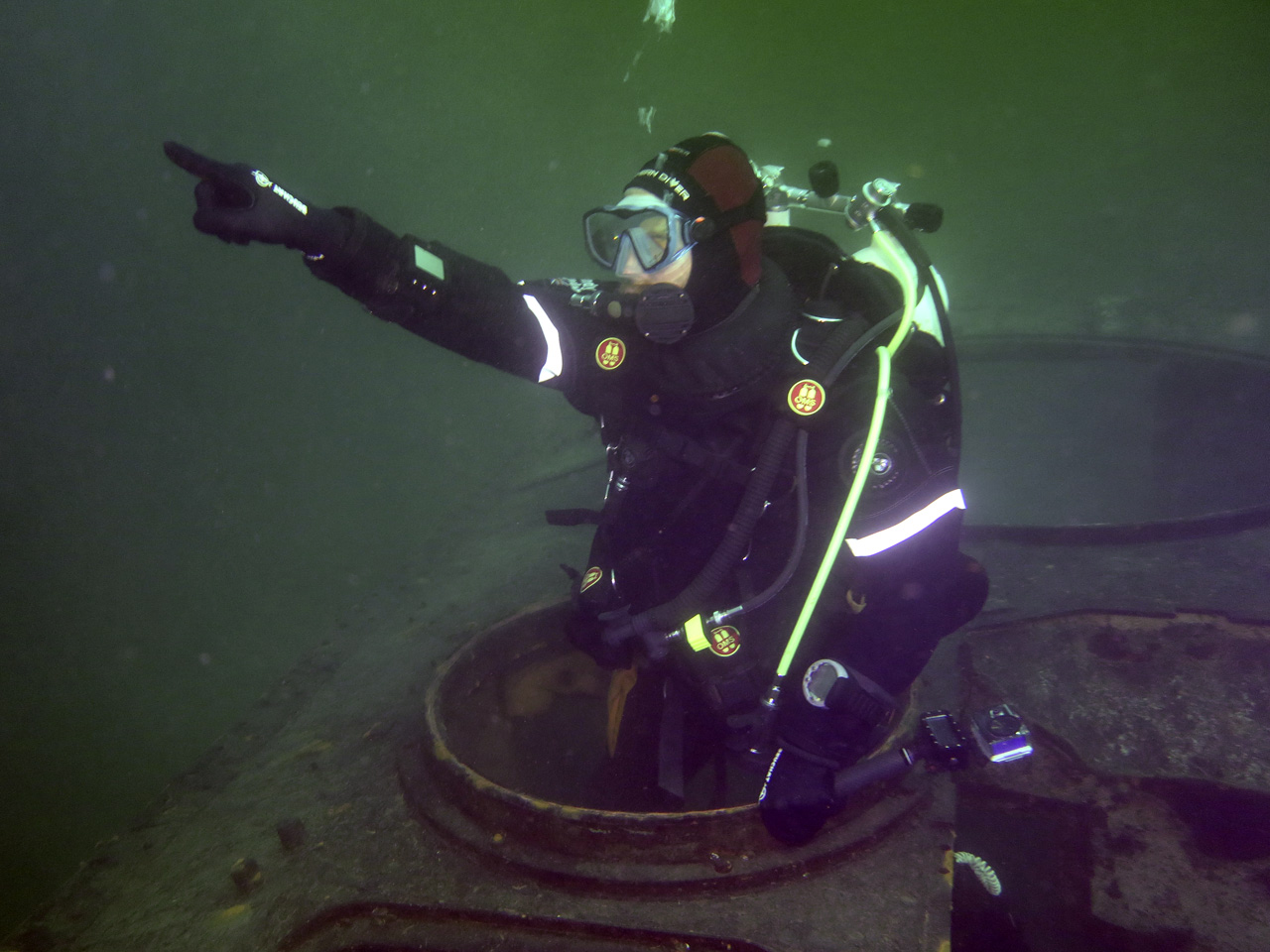 Her bow is 31 metres below the surface, her central section is upright but the forward section is listing at around 45 degrees to starboard.