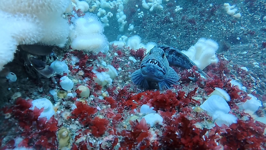 To be honest, though, it all looked much of a muchness after a while and while there were plenty of crabs and lobsters around and the usual selection of fish, I didn't find anything particularly exciting until towards the end of the dive when I spotted a fish tail flick behind a rock ledge just ahead of me. I didn't recognise it as any of the other fish types we'd seen on the dive to that point, so swam across and was greeted by a Wolf Fish sitting on the rock.