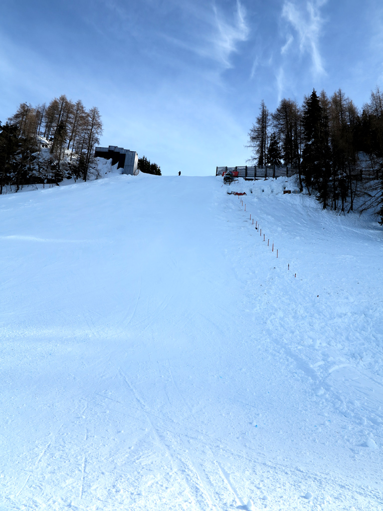 After lunch, I decided one more run down the Streif was required, but having done the first part, I noticed a group gathered atop the Mousetrap (Mausefalle), but not tape, closing it off.
