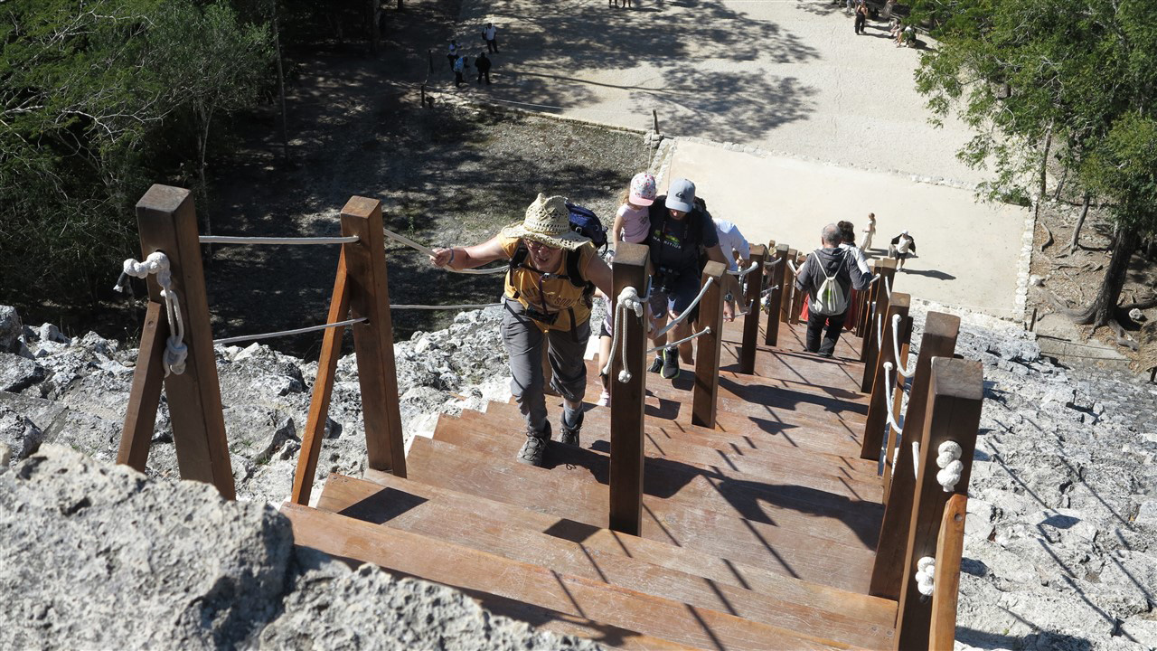 The pyramid is a very steep structure, which has (since December 2025) had a wooden staircase added to allow people to climb up the, otherwise uneven, stone steps.