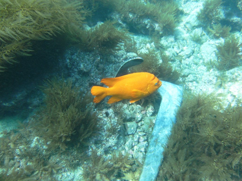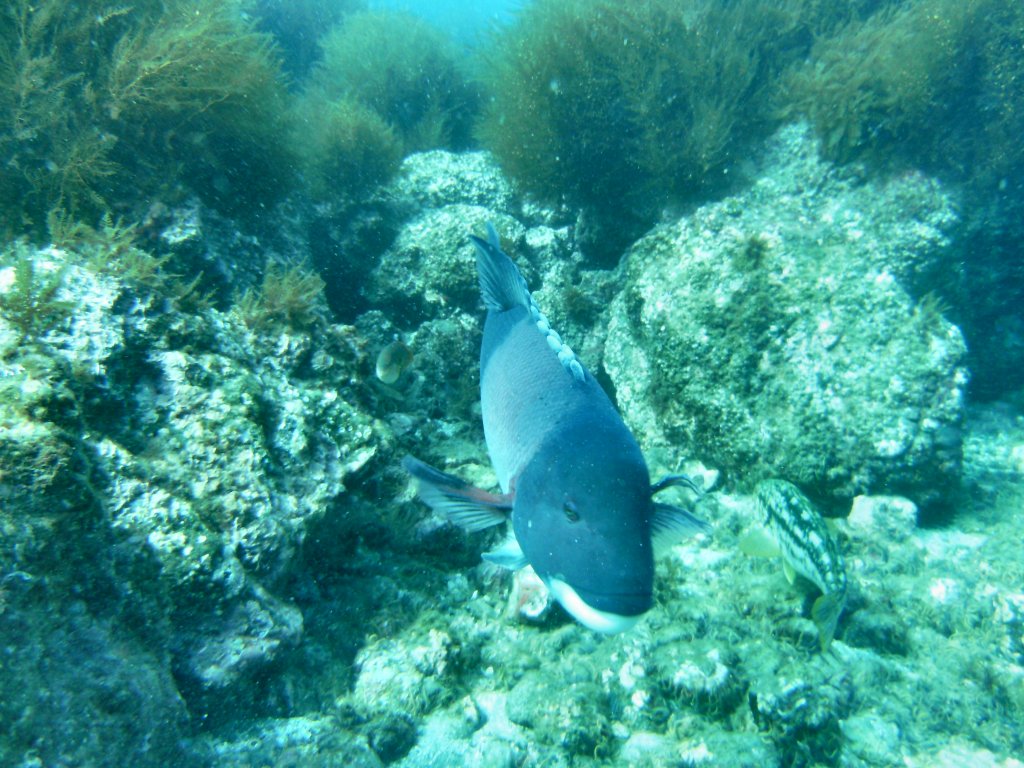 With all the Pelicans away, there are 3 months a year when you can dive here. We dropped in, Jerry (a semi-retired photo-journalist) was keen to try out his newly acquired Nikonos dive camera (a 35mm!) and we found plenty of fish around, including some large Sheepsheads and , a number of Gobies and plenty of the goldfish like Garibaldis. The site was rocky, but pretty flat and only 11m at the deepest, so there was plenty of light to search out the fish.