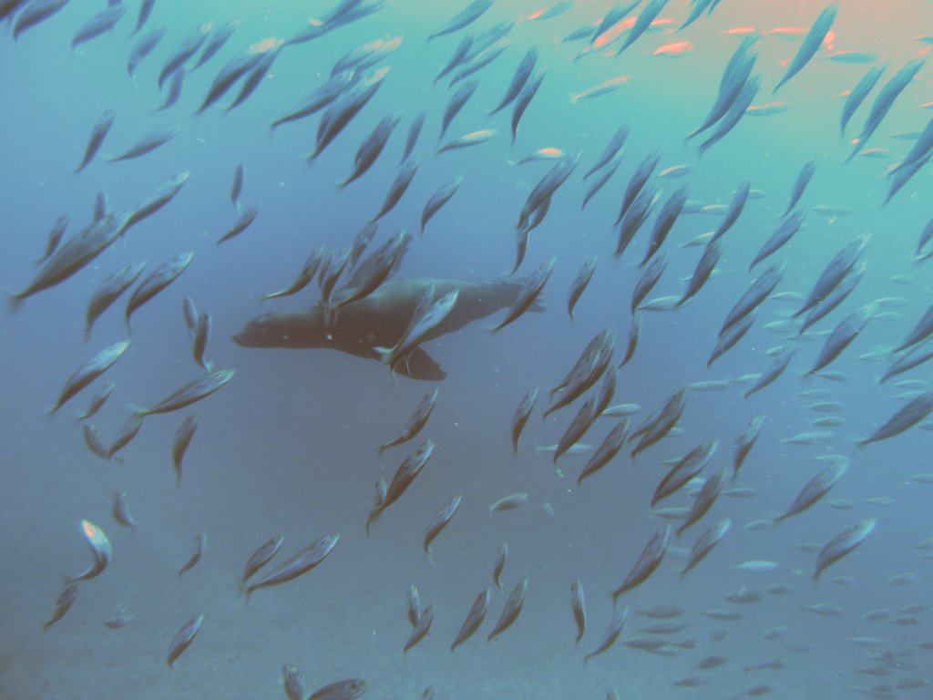 There was a distinct wall on one side and as we swam along this, we spotted a large shoal of fish suddenly dart as one. Moments later a Sealion appeared, hunting the fish and seemingly oblivious to us. We watched it hunt for a few minutes and then moved on as it swam away.