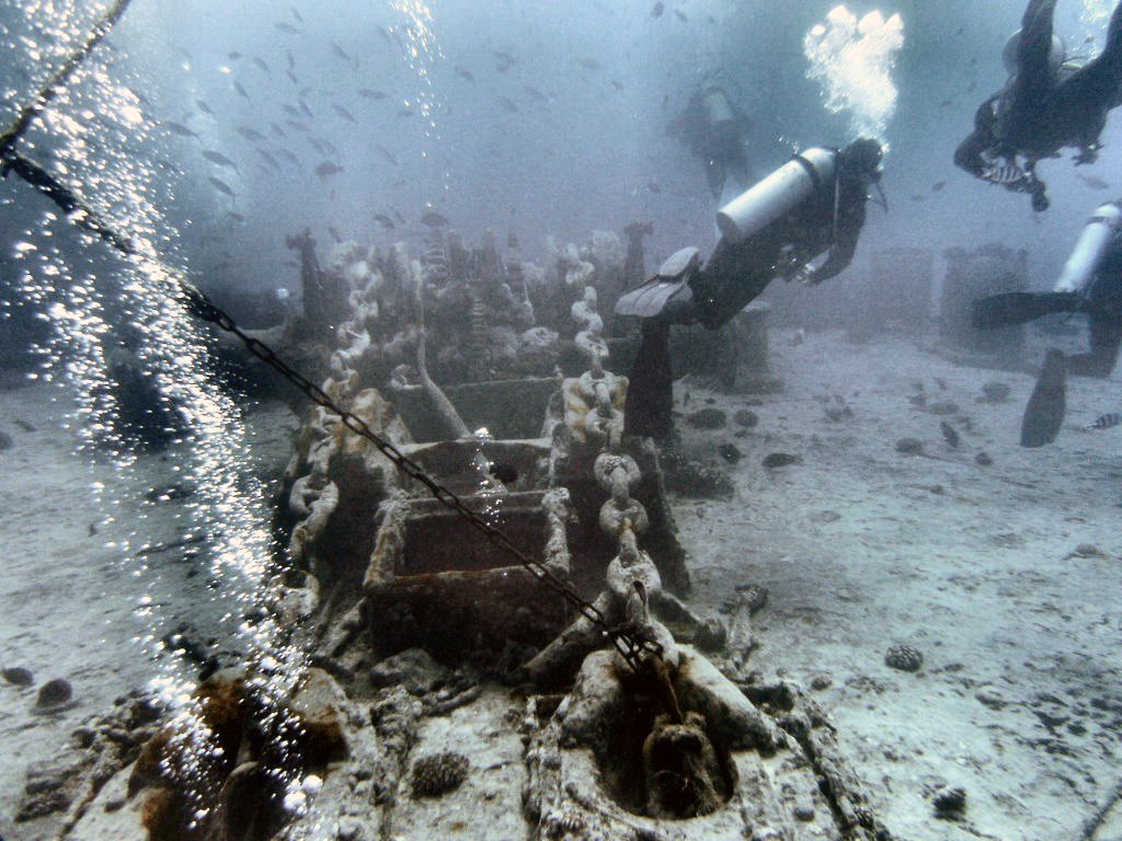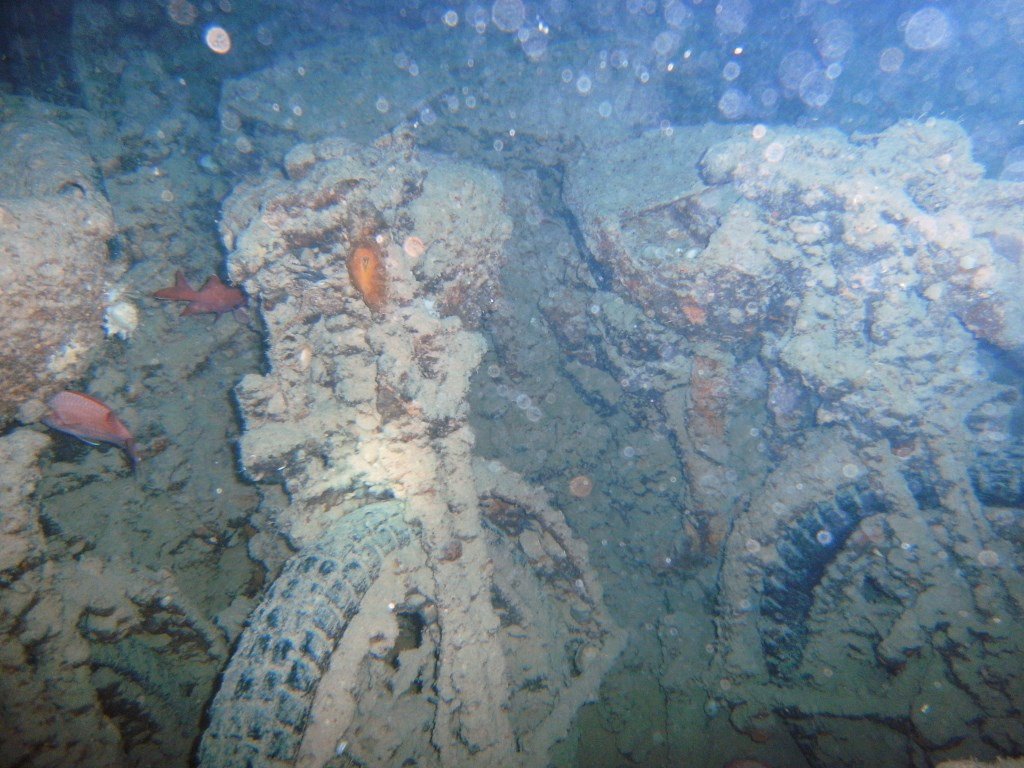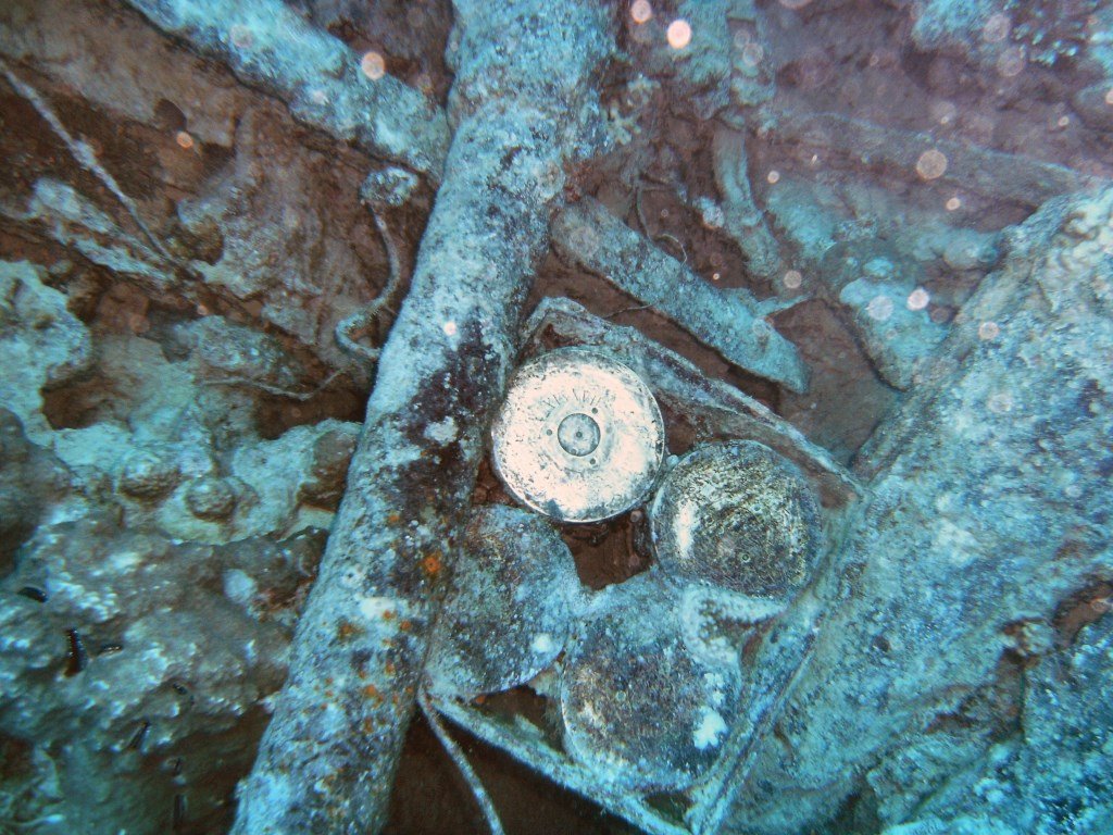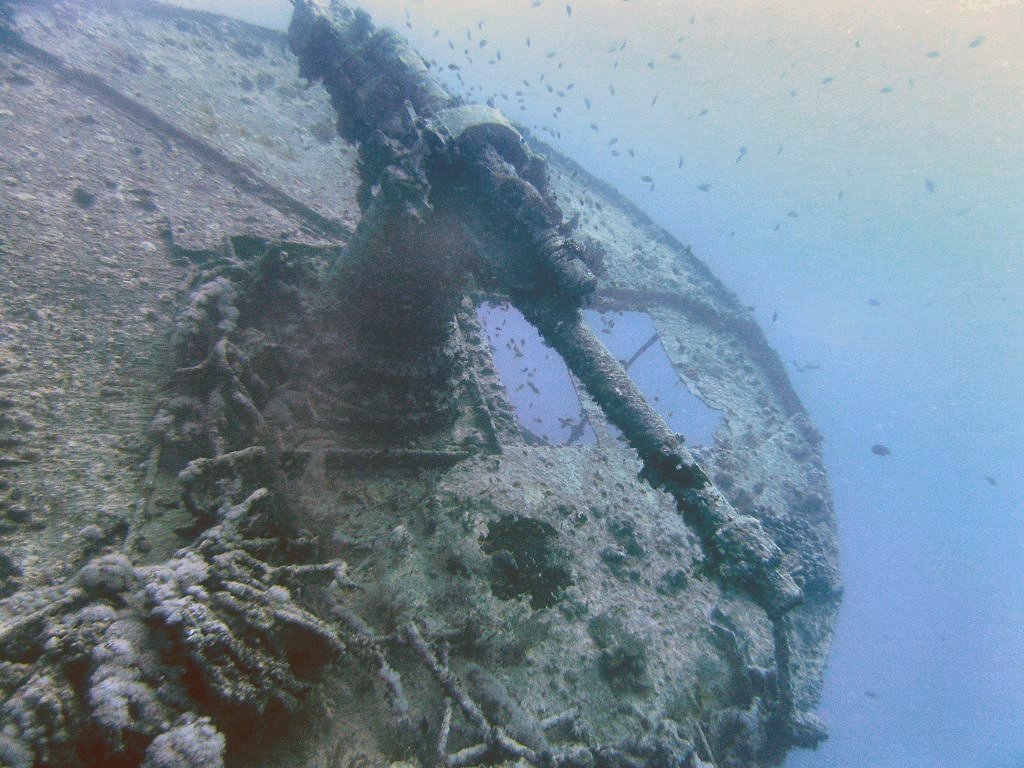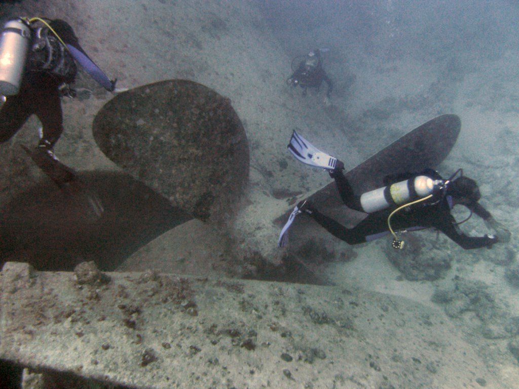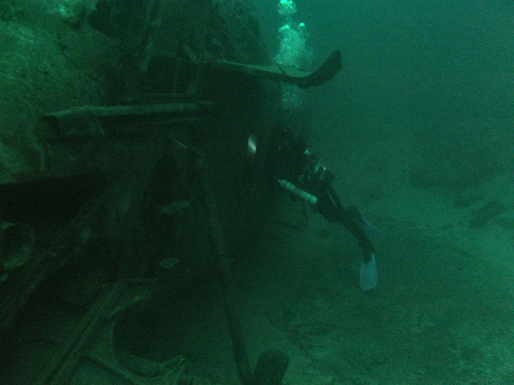 We swam over to the port side and then along, over the wreckage of hold 4, past the Bren Carriers, to the guns on the rear deck and then down to the propellor and rudder.