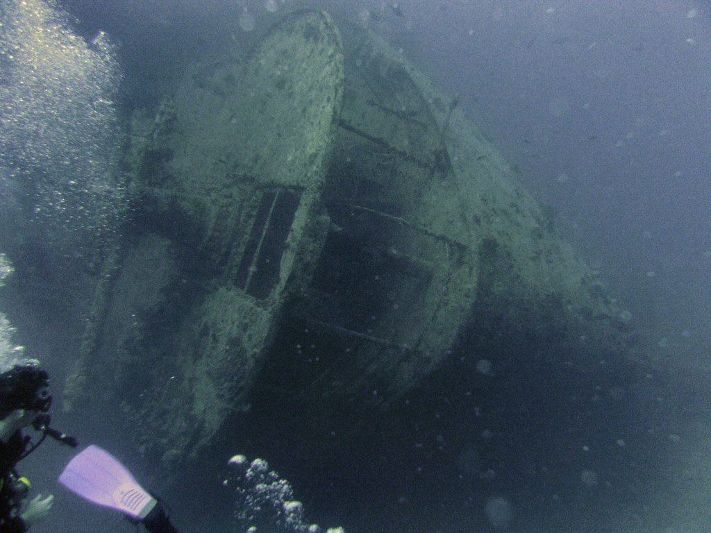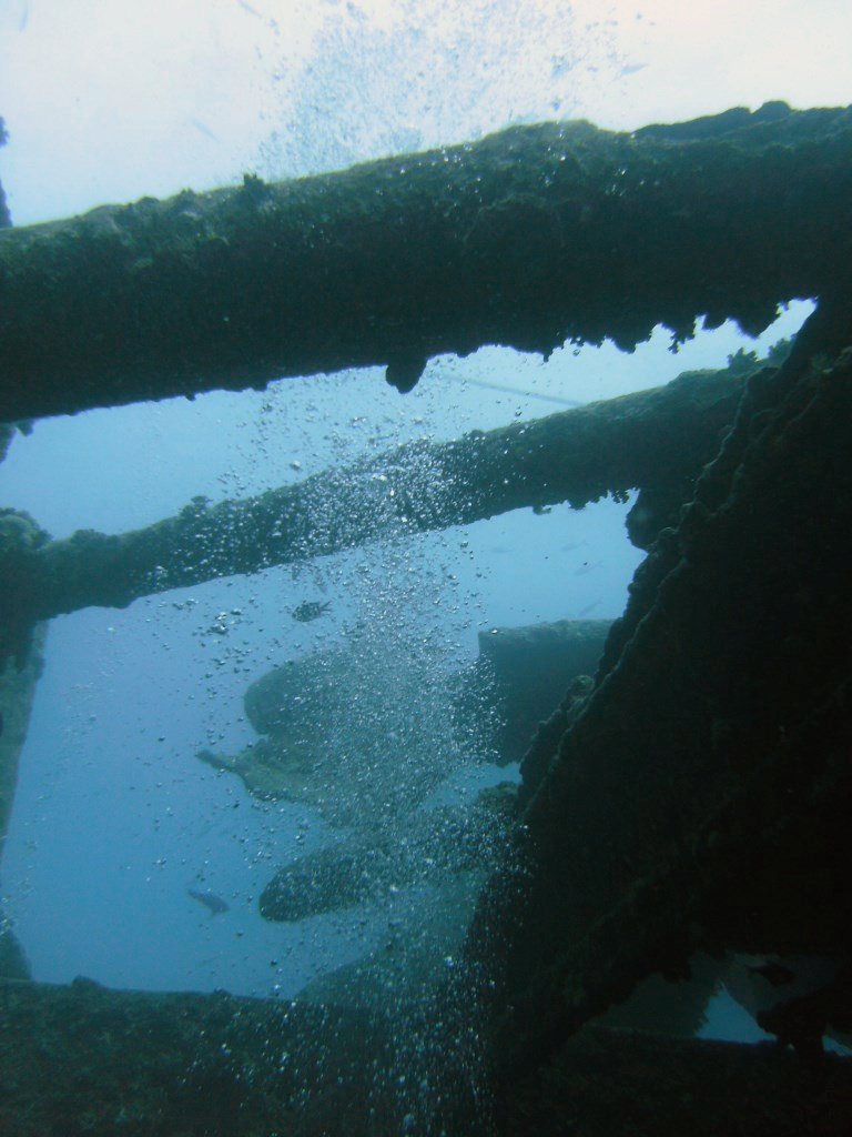 We swam along the outside of the upturned hull until we reached the stern and the propellor and rudder, which some swam between as some blades are missing from the propellor. Then we ducked in through a hole in the hull and swam back up through the wreck.