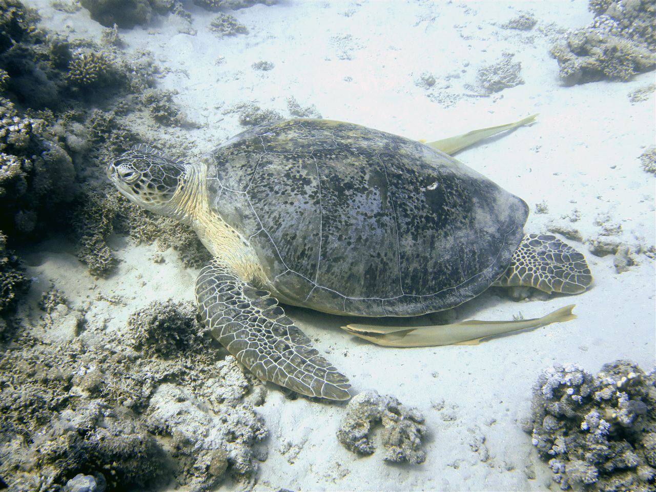 Sure enough, sitting there untroubled, with 3 remoras, was the biggest turtle I’ve seen.