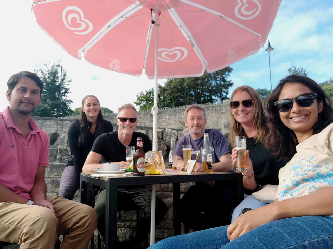 A final drink and a bit of cake in the sunshine to celebrate a great weekend's diving - L to R Rohit, Nicole, Julian, Me, Dawn, Ria