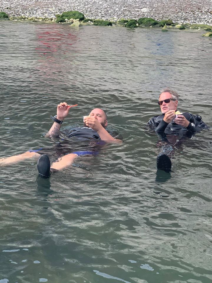 On the way back, we stopped into a very busy Lulworth Cove, where Julian and Ollie waded ashore and returned with ice cream for us all, which was a nice way to follow up the dive.
