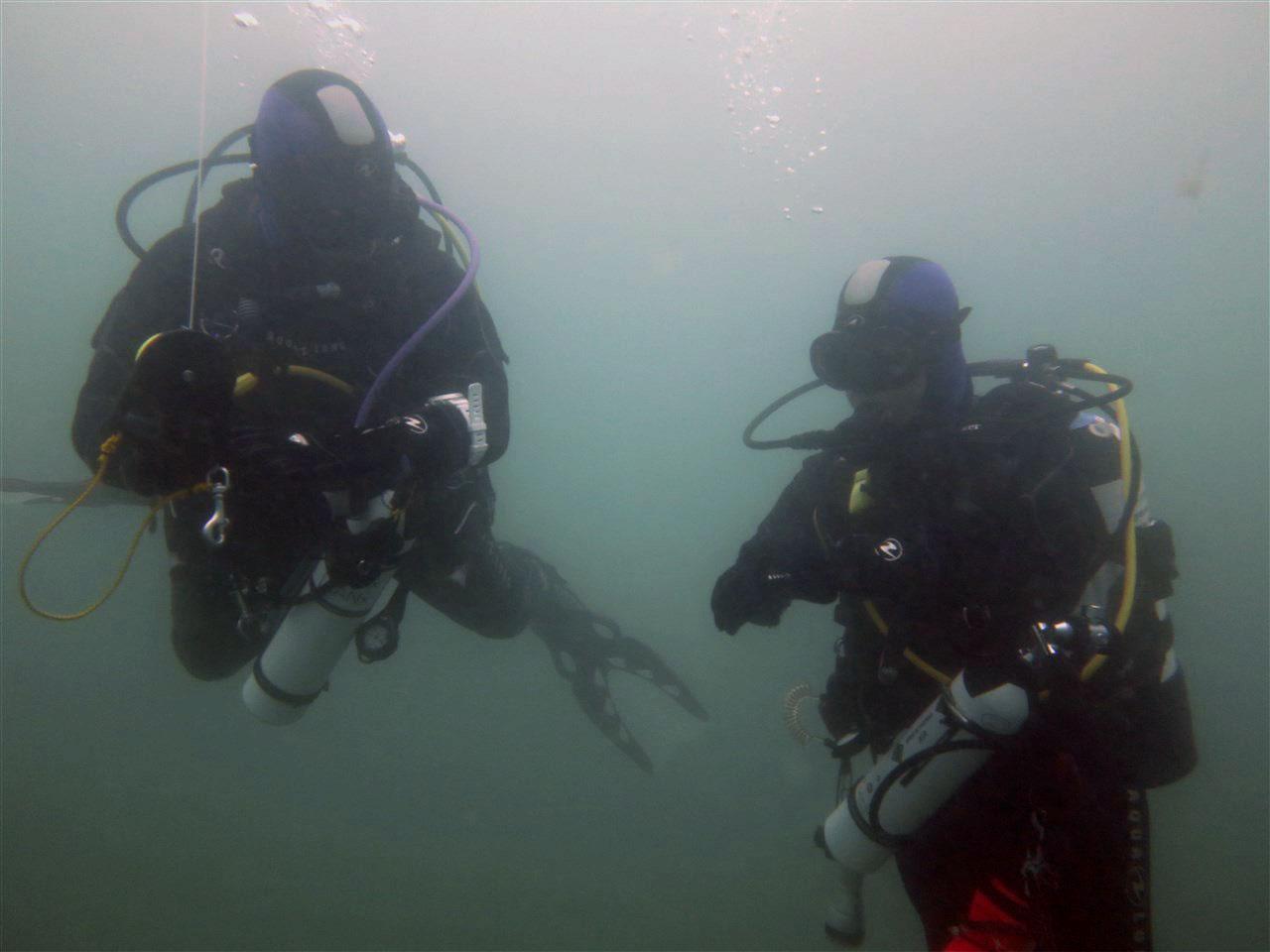 On this dive, I dived with Nicole, and our first job, as last pair in, was to send the shot weight back to surface on a lifting bag. It was a heavy shot and my first attempt on lifted it a couple of metres, but another burst of air from my spare regulator soon saw it heading for the surface.