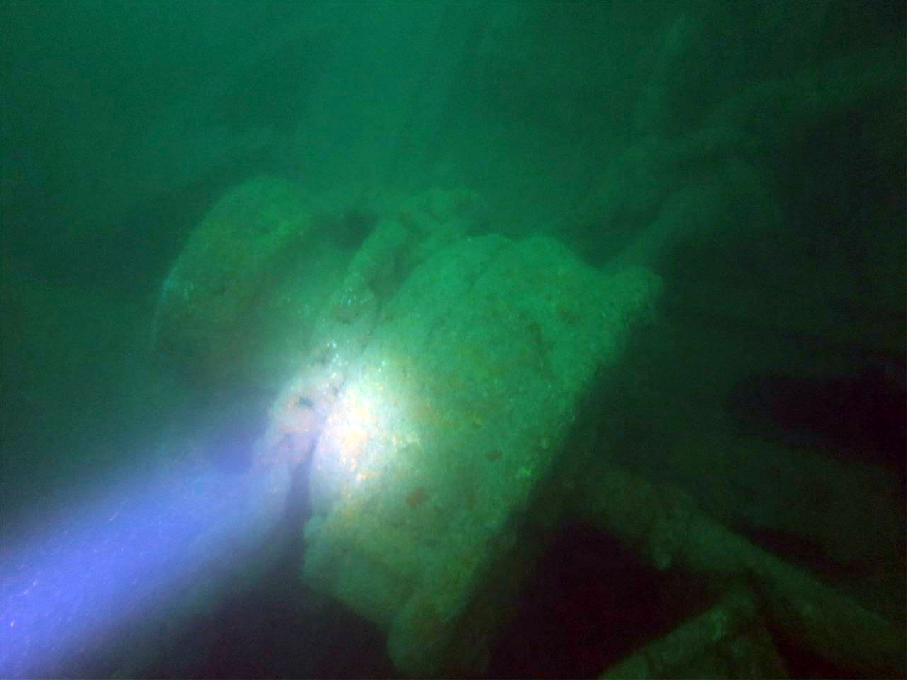 We landed amdiships, although it wasn't easy to tell, and headed aft, passing various parts of wreckage and coming to the steering gear that stood clear of the seabed.
