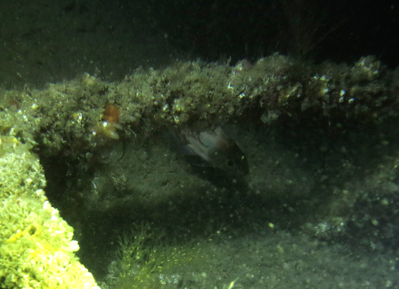 Passing the boiler still within the wreck, visible through holes in the plates, we suddenly found ourselves in a strong current, which we swam out of into shelter.