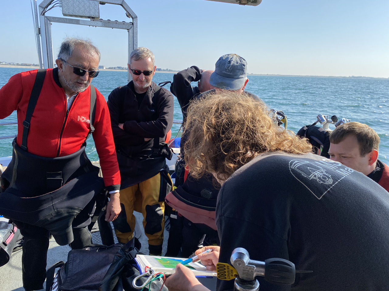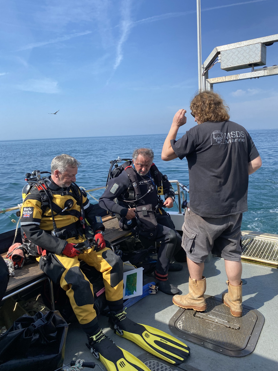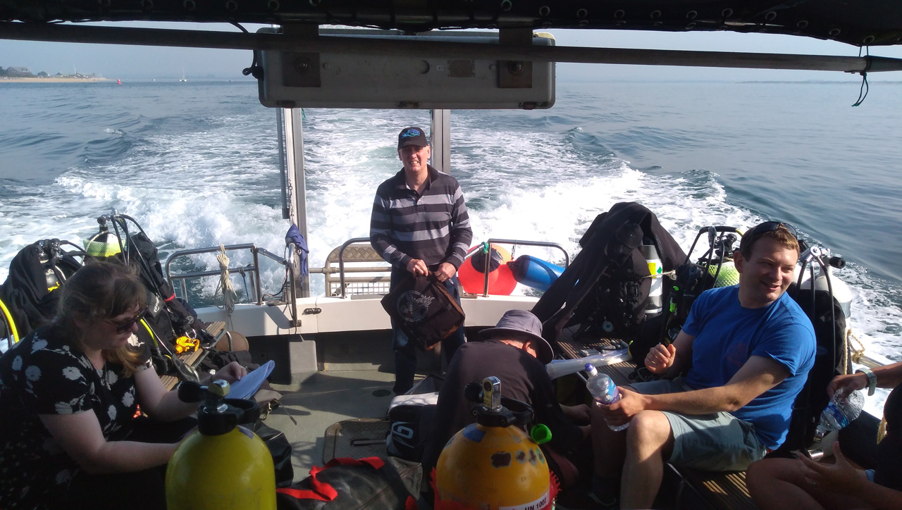 Meeting at 9AM at Itchenor Harbour, we soon had the boat loaded and set out down the river and across Bracklesham Bay to the wreck, flat calm waters reflecting blue skies and bright sunshine.