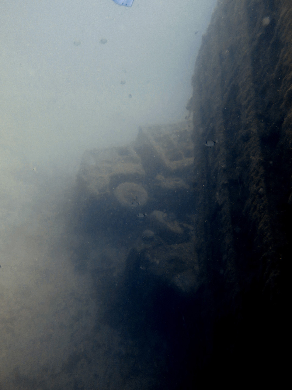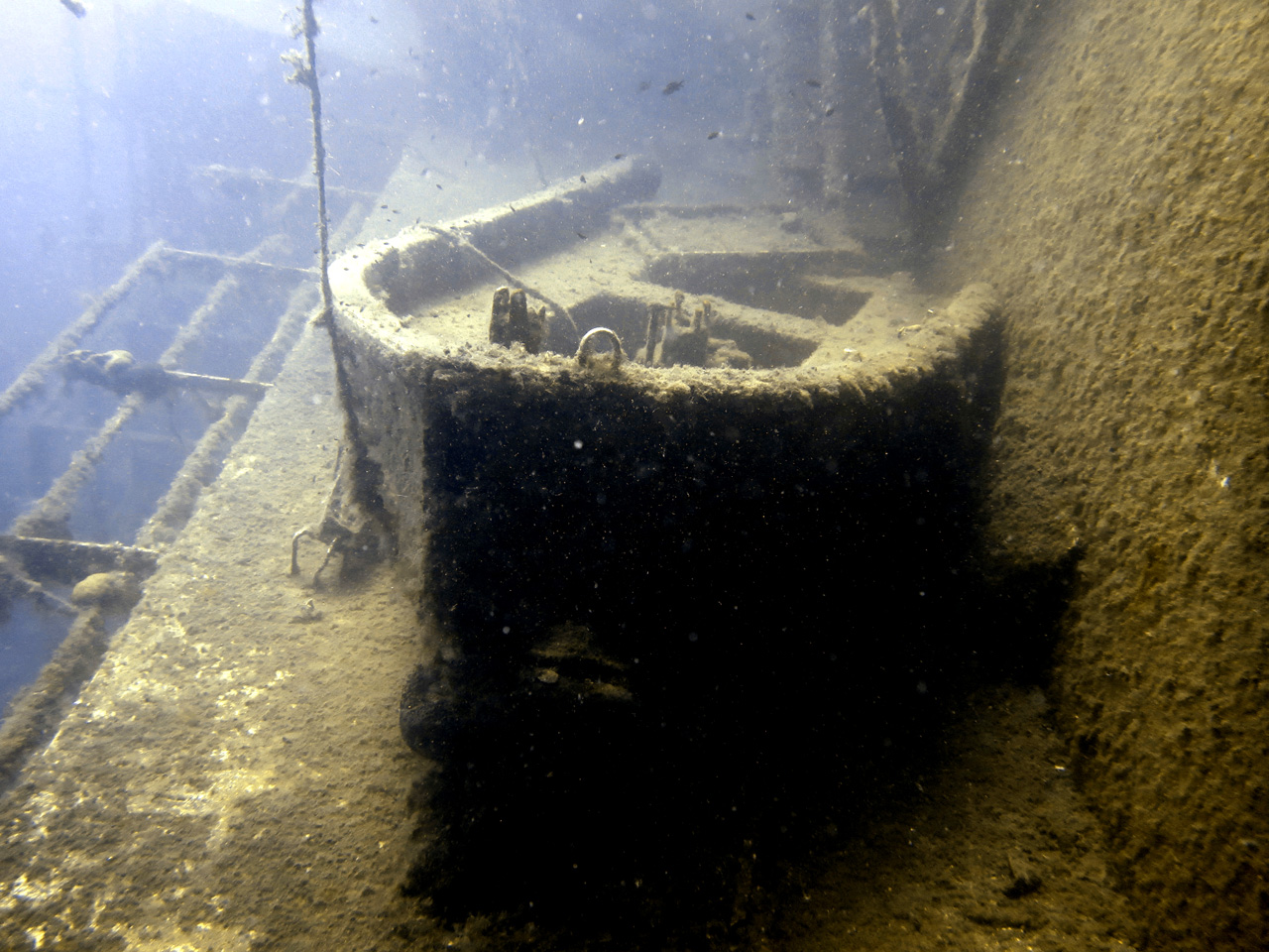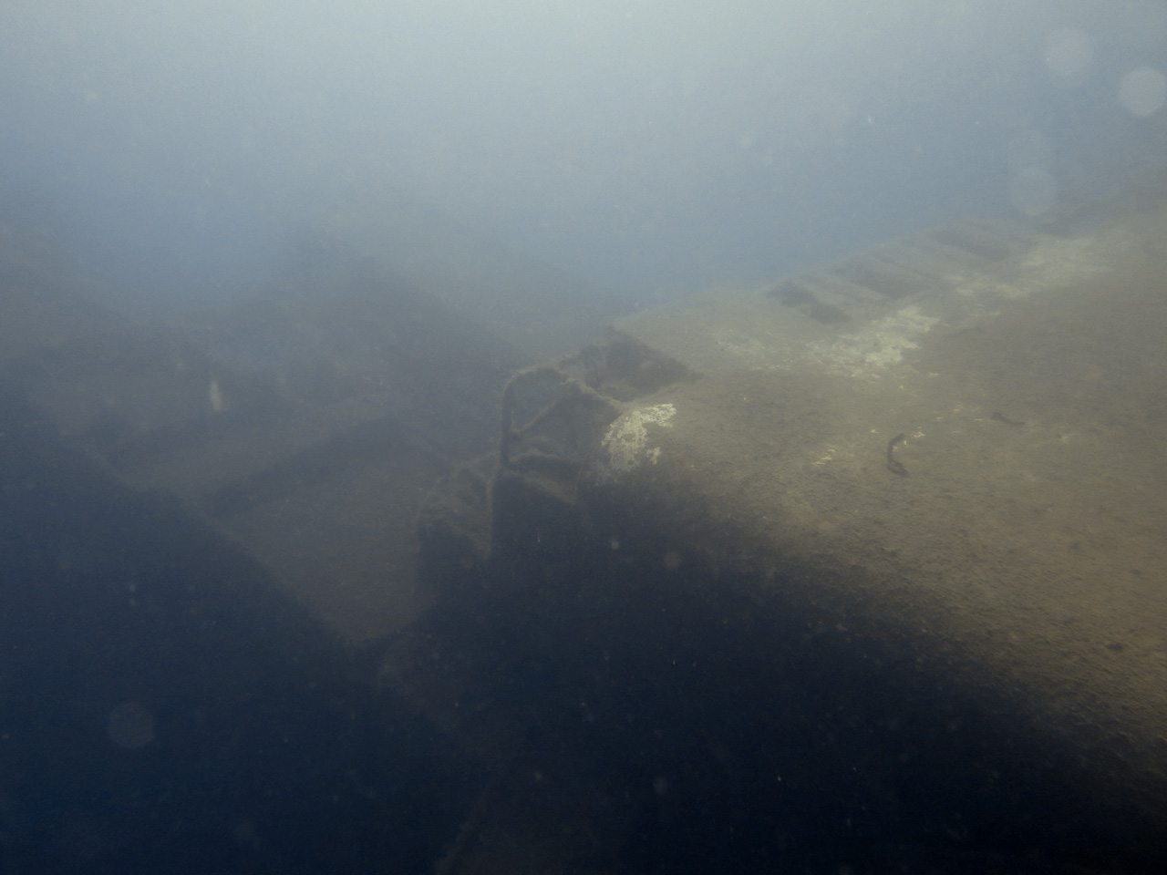 For the first dive, we stayed outside, exploring the stern doors and open cargo deck.