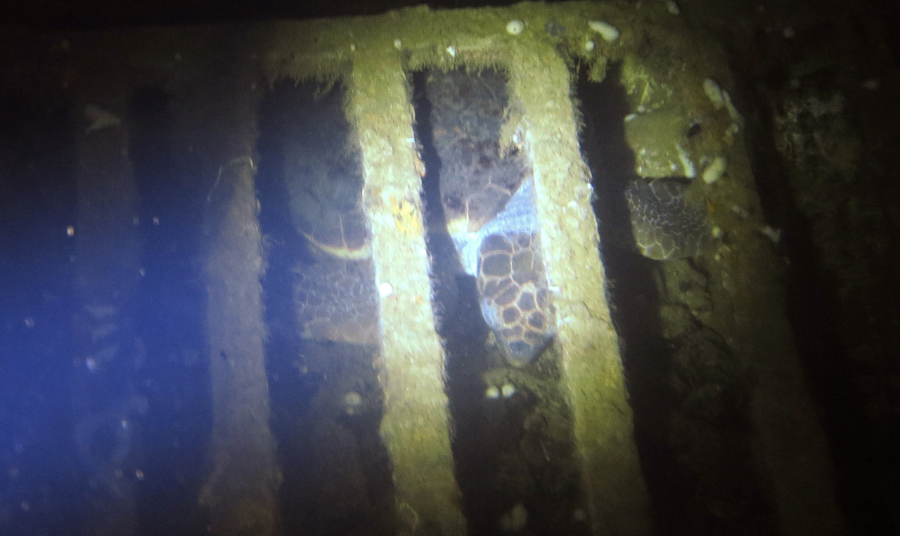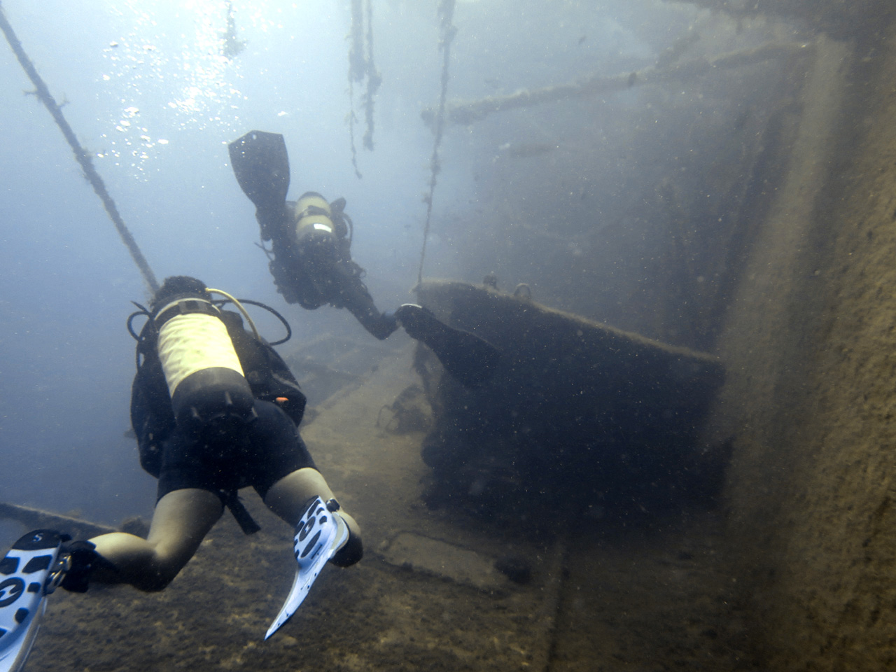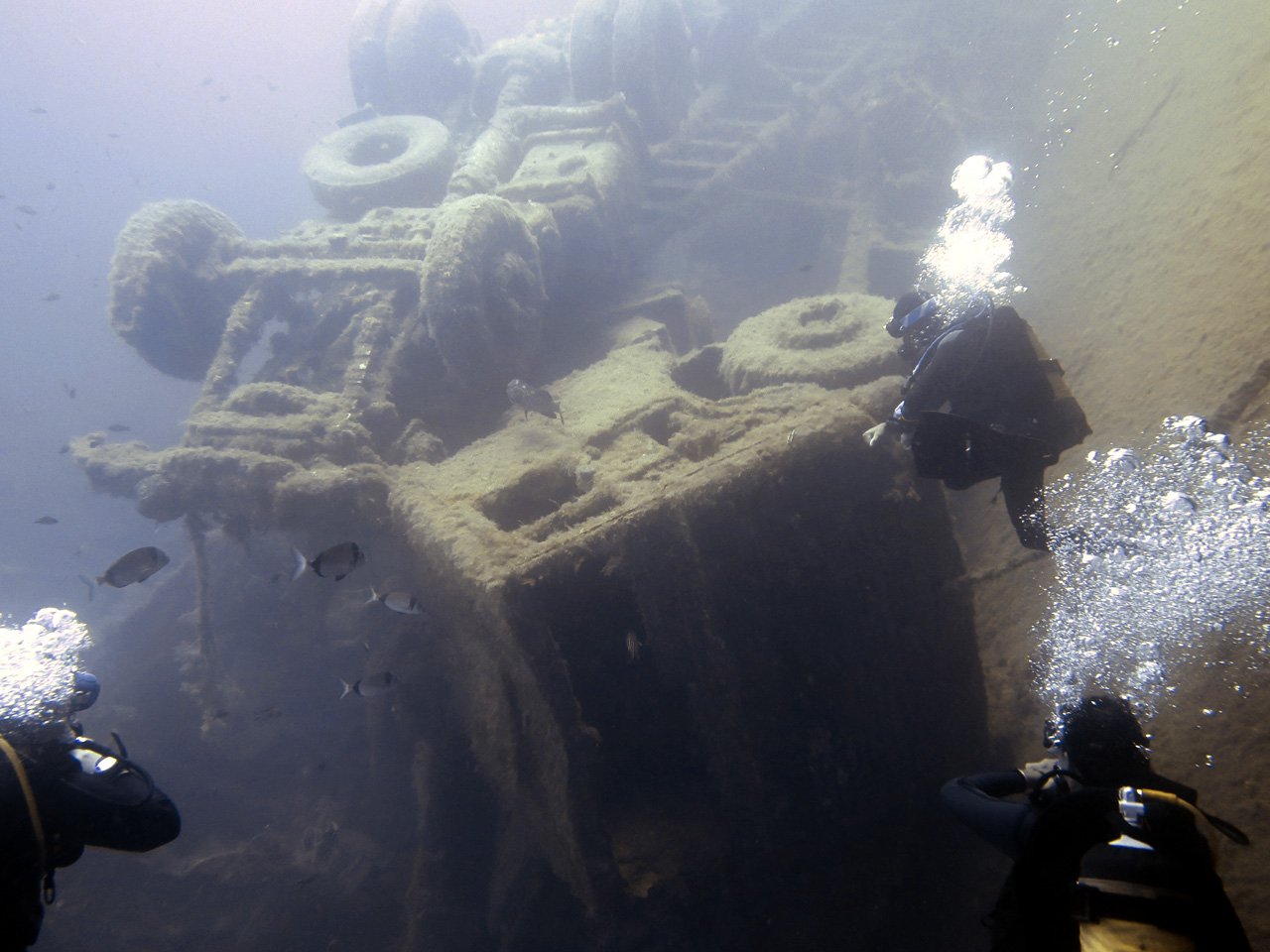 For the first dive, we stayed outside, exploring the stern doors and open cargo deck.
