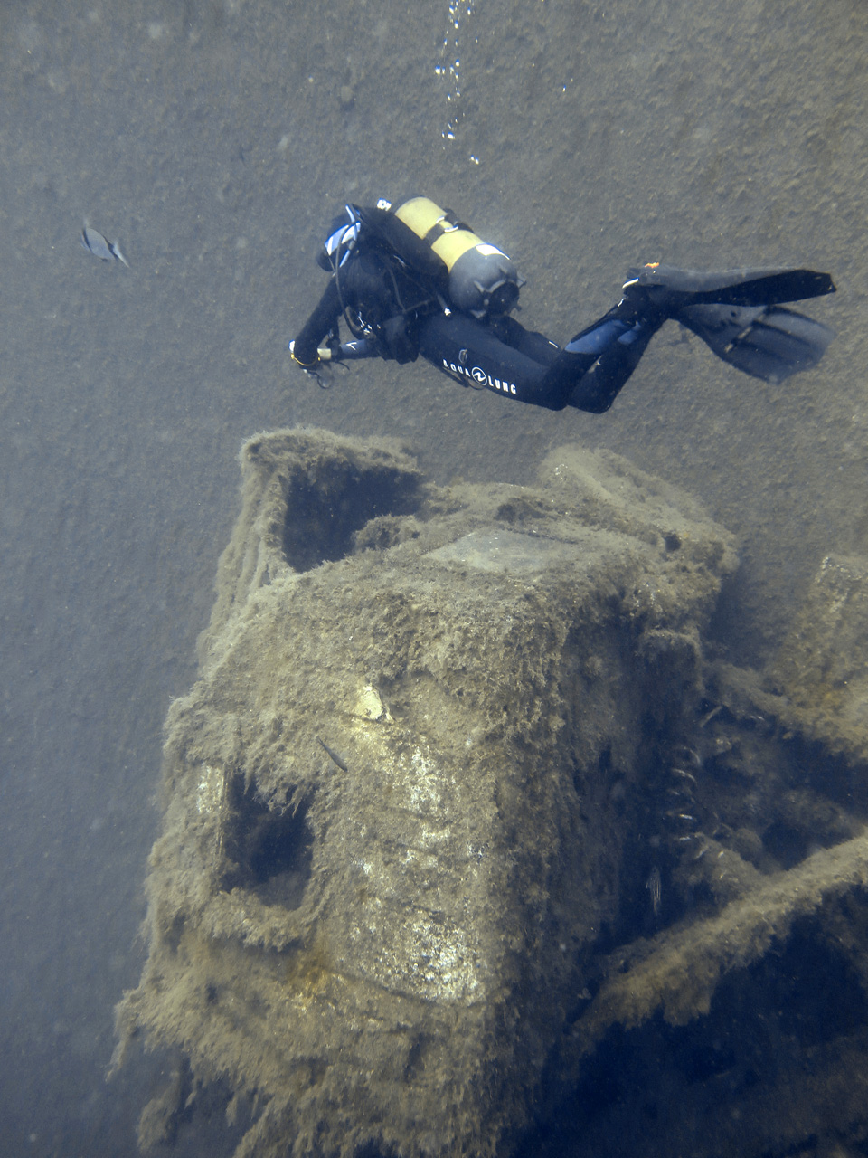 We dropped down to the hull, looked at the prop and then around to the stern doors/ramps, where we could see a couple of lorries lying on the seabed (wreck lies on its port side).