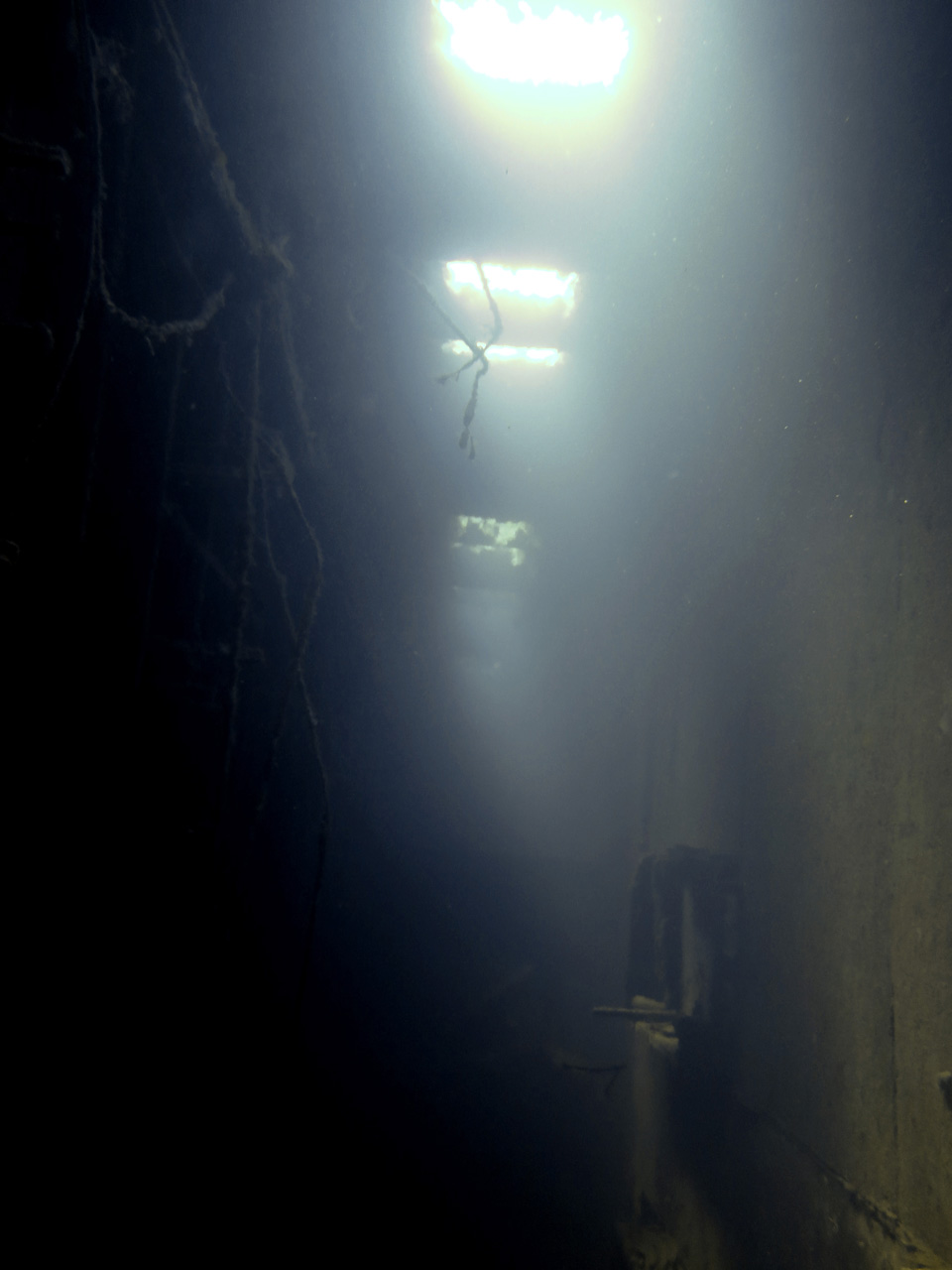 We swam around to the right, past all sorts of pipes, etc and then dropped down a little to the max depth and then moved back out of the engine room after only 3 minutes or so.