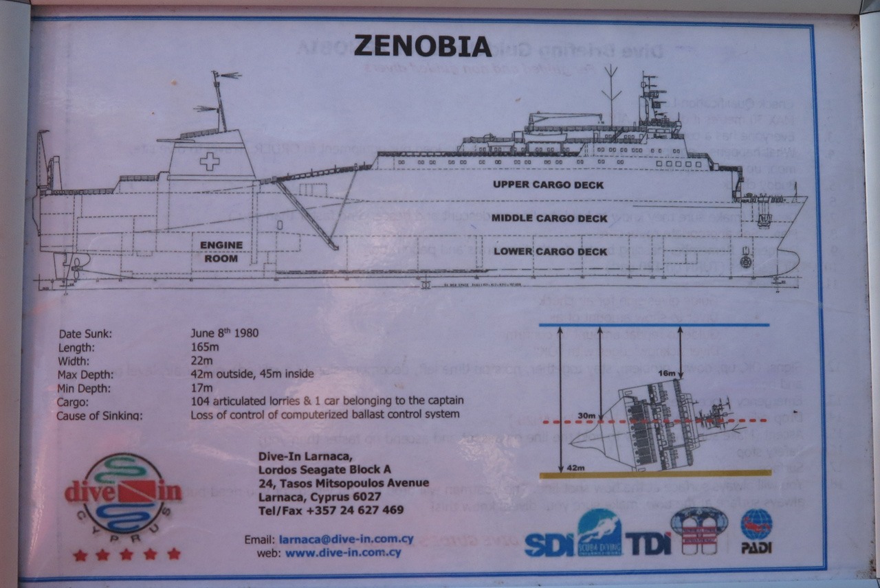 The Zenobia was a new truck ferry that de"veloped computer problems which eventually caused it to capsize off of Larnaca in 1980. It lies in around 42M of water, complete with most of its cargo of trucks - Read more here.