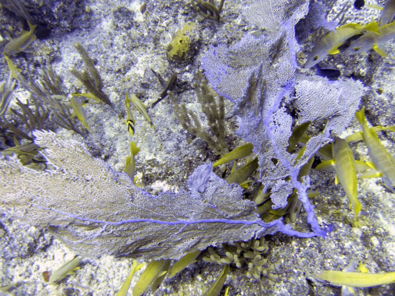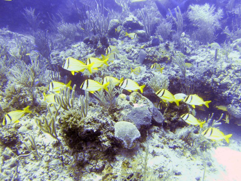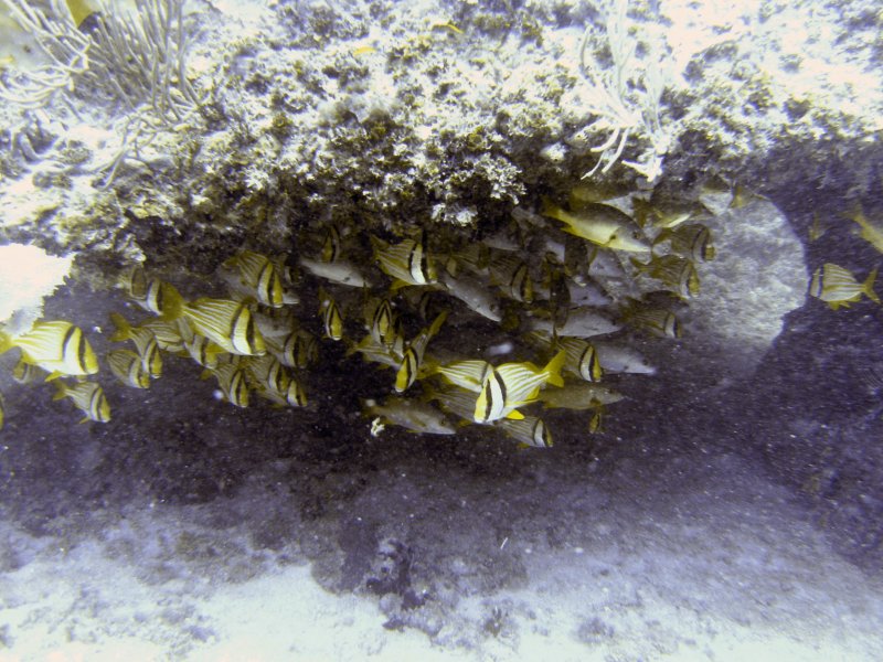 There were Congers, Lion Fish,Grunts (blue striped and the colourful Porkfish), Jawfish (who hid in holes on the seabed and pop out their heads to eat), Angel and the similar Butterfly fish, what looked like Wrasse and smallish Groupers and numerous other fish species which I couldn’t identify, as well as abundant coral.