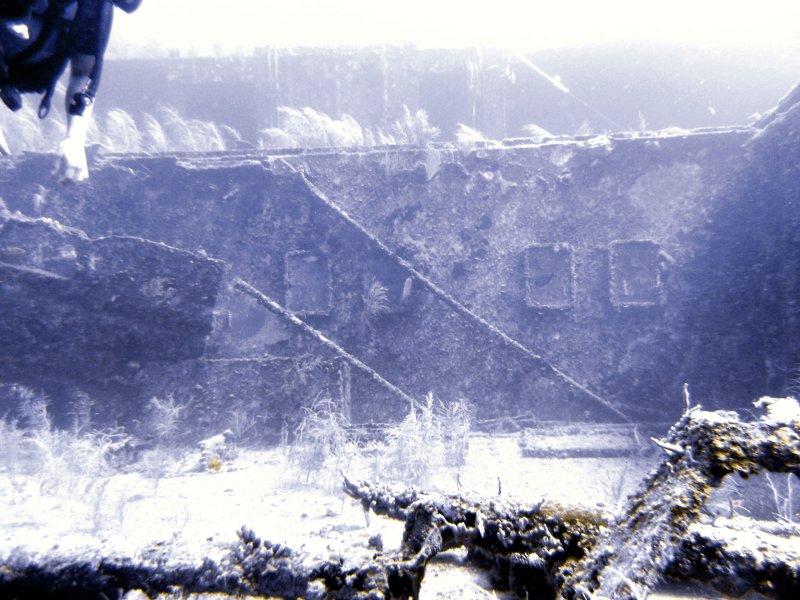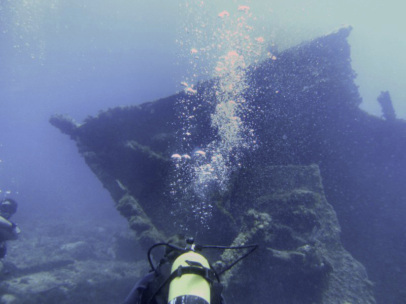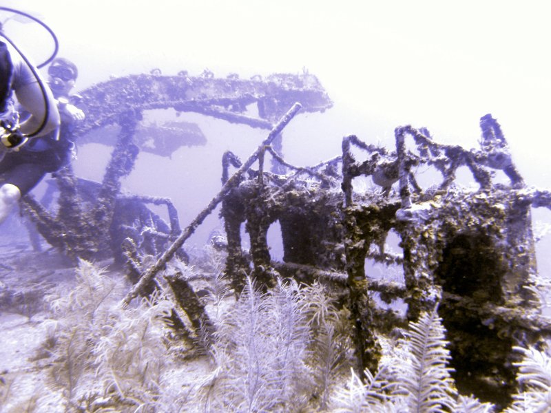 Swimming up and down the decks, through a few of the openings and around the remains of the hull was a great dive, but all too soon we were heading back to the shotline and surfacing.