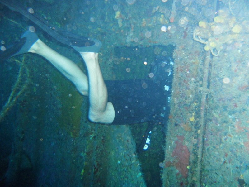 I got out okay and handed the tangled mess to Graham and my course-mate repeated the action, having a bit more luck (or skill) with his reel, whilst I and a Dive Master hung around the entrance in the top of the bow.